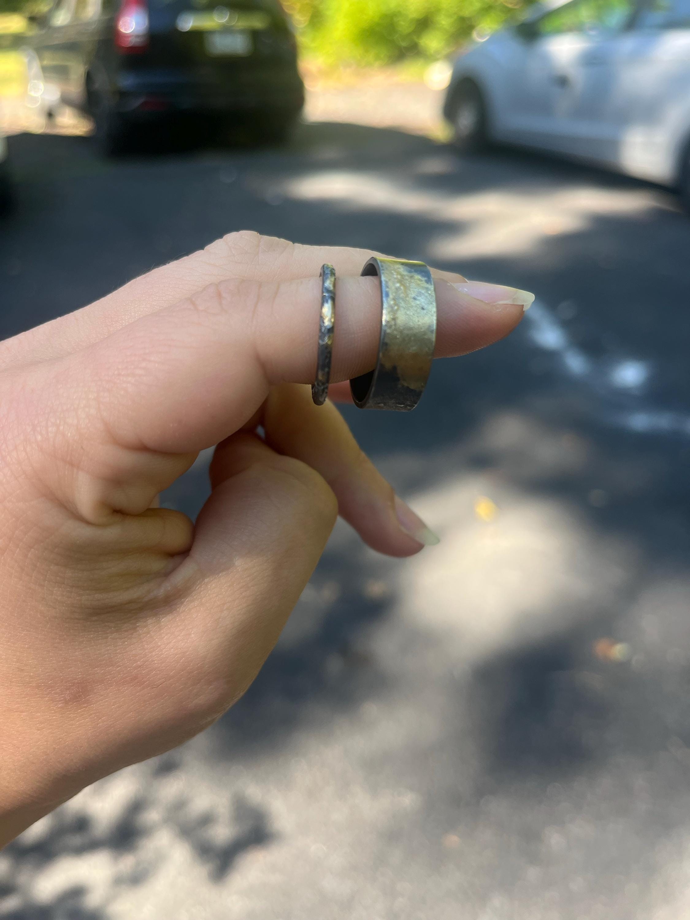 The patina will wear away differently for each person, making your ring truly one of a kind. Surfaces polish more quickly, while the hammer impressions will stay dark.