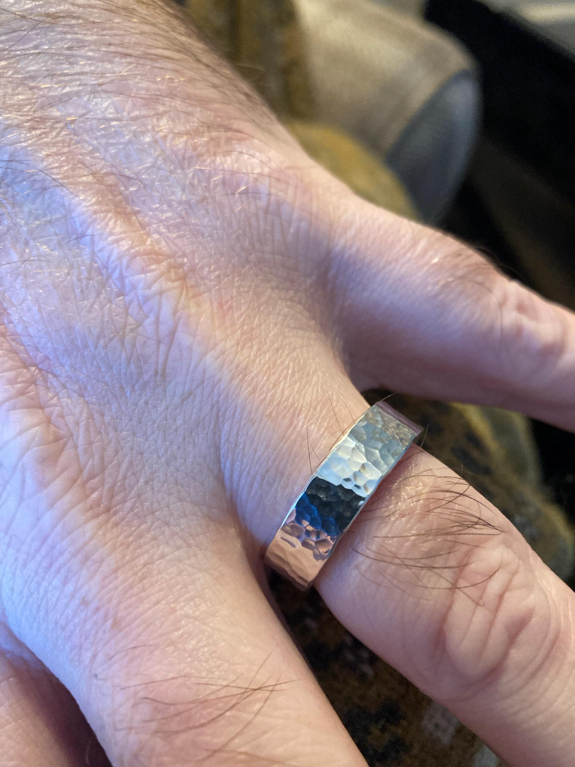 Introducing the Spectrum Vitae Ring – a robust and substantial piece crafted from sterling silver, designed to make a powerful statement. At 6mm wide and 2mm deep, this ring offers a chunky and weighty presence on the finger, embodying both durability and timeless style. Its minimalist yet bold design is enhanced by a hand-hammered texture that creates a unique play of light, giving each ring a distinctive, organic character.