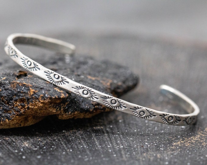 Mesa Spirit Cuff, Sterling Silver, 3MM, Hand Stamped Evil Eye Cuff Bangle, Navajo Patterned Cuff, Talisman Cuff, Adjustable, Gift for Her